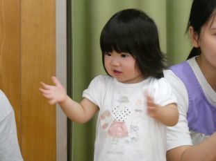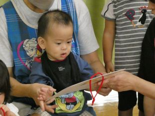 8月の誕生会をしました。始めに担当保育士が出し物をしました。どのクラスも興味をもって見ていました♪